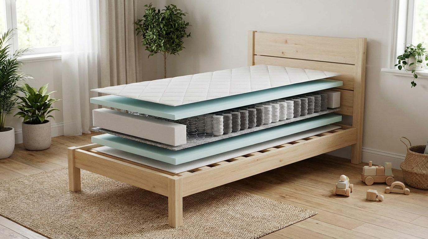 ECO MATRAC PRE DETI A DORAST je obojstranný taštičkový matrac s dvoma úrovňami tuhosti – strednou (3) a stredne tvrdou (4), ktorý je ideálne prispôsobený potrebám detí a dospievajúcich. Matrac je vyrobený z kvalitnej PUR peny s hustotou 35 kg/m³, ktorá zabezpečuje pohodlie, správnu podporu a zdravý vývoj chrbtice.