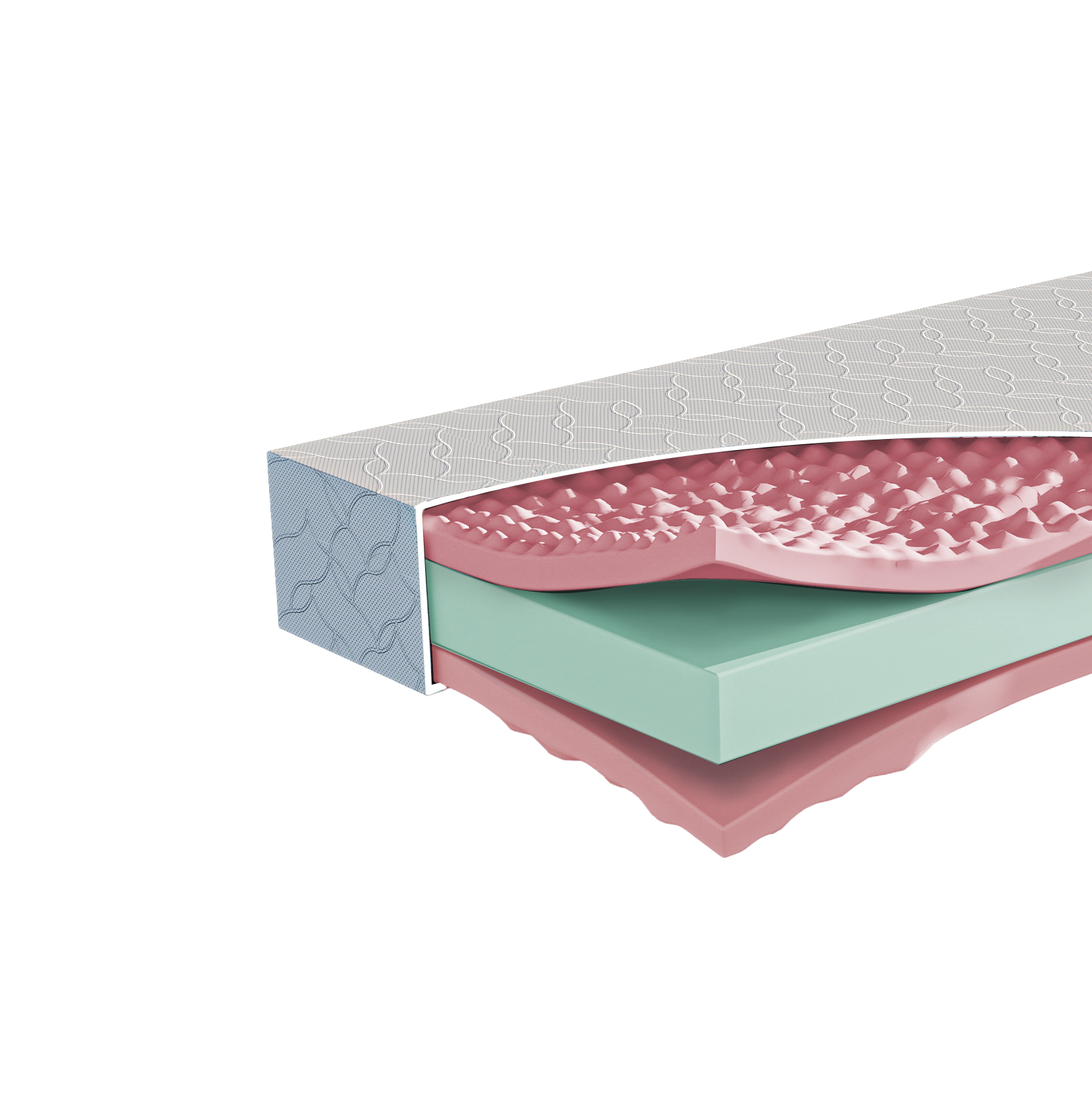 Matrac je vyrobený z kvalitnej PUR peny s hustotou 30 kg/m³, ktorá sa vyznačuje dobrou nosnosťou, tvarovou stálosťou a dlhodobou odolnosťou. Pena zabezpečuje rovnomerné rozloženie hmotnosti tela a podporuje zdravé držanie chrbtice počas spánku. Obojstranné prevedenie predlžuje životnosť matraca a umožňuje striedať tuhosti podľa aktuálneho pocitu alebo sezóny.